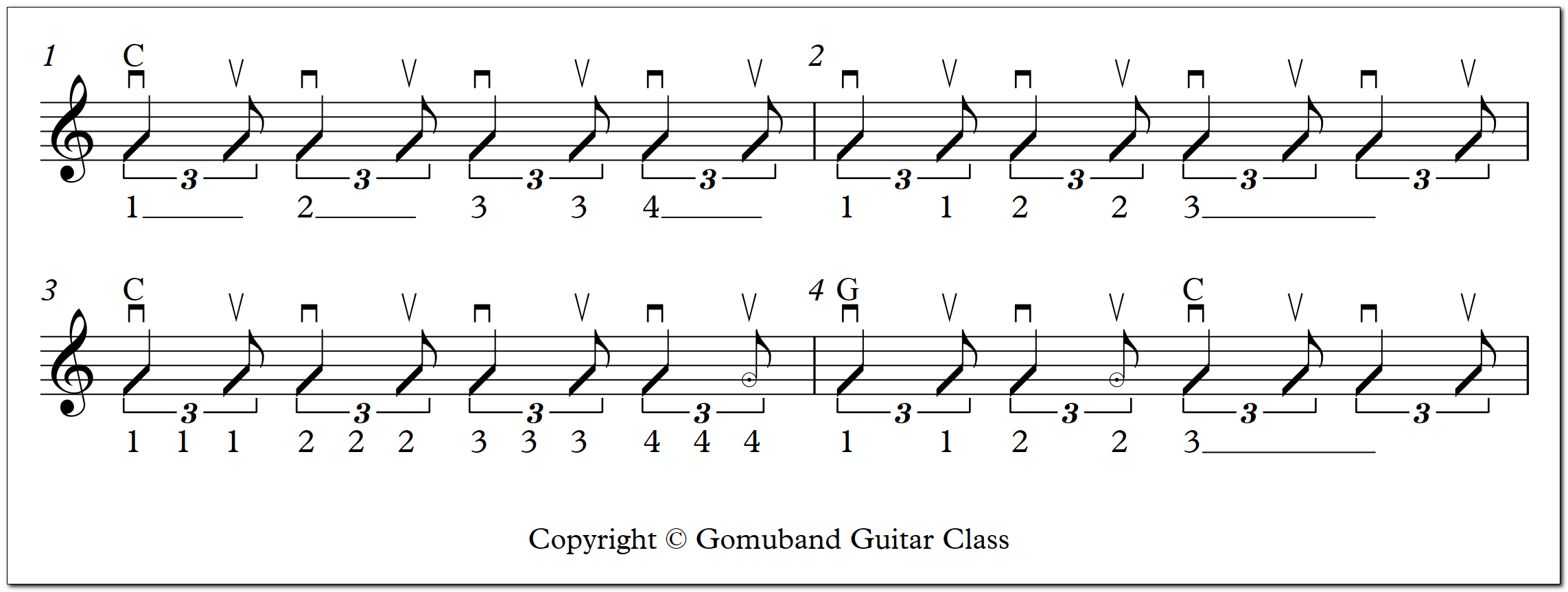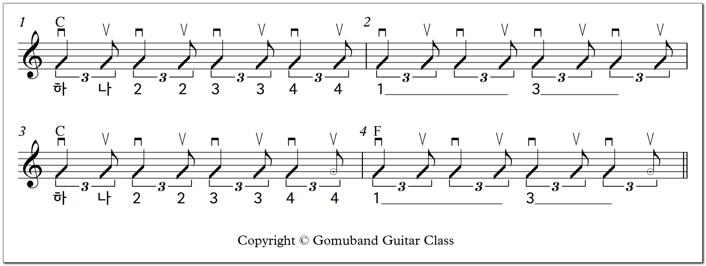 오른손으로 천천히 여섯 줄을 모두 다운-업 스트로크로 치면 됩니다.