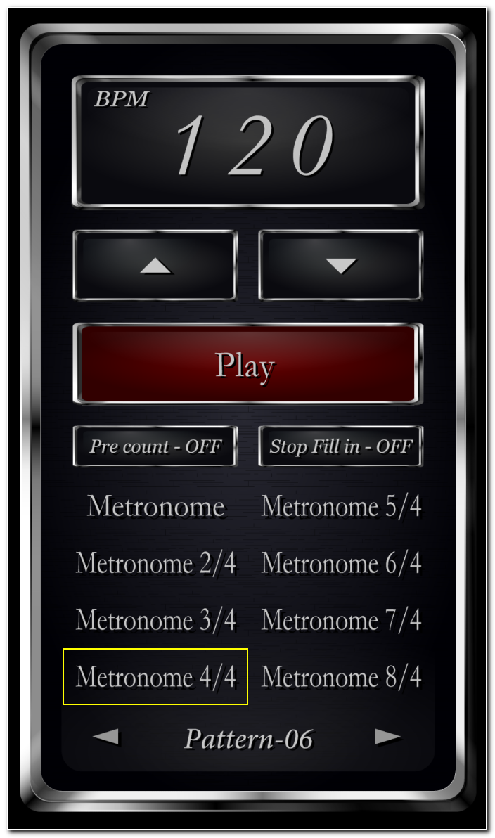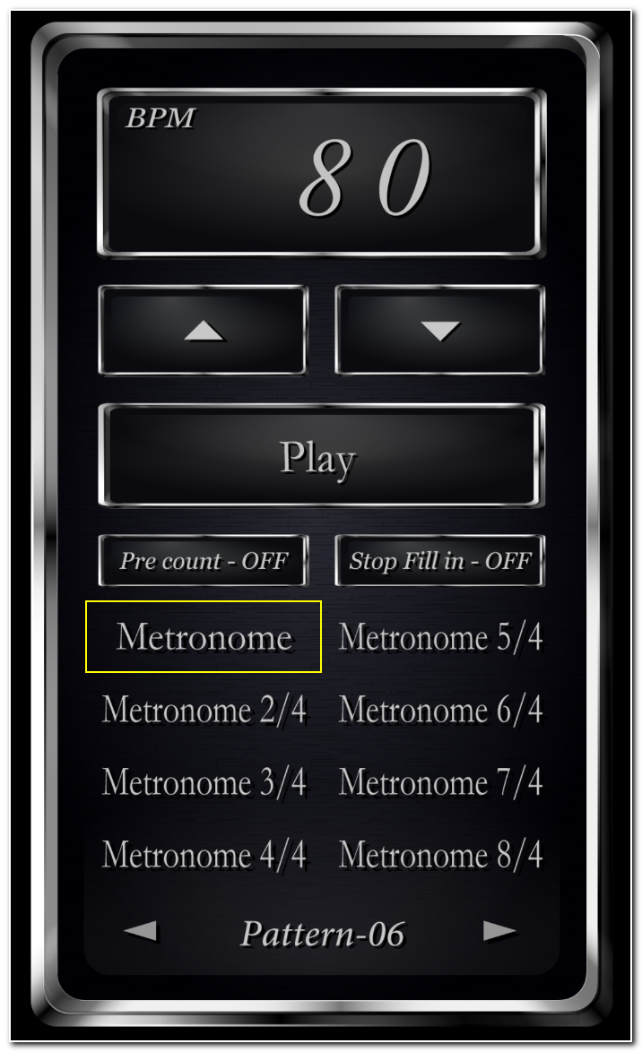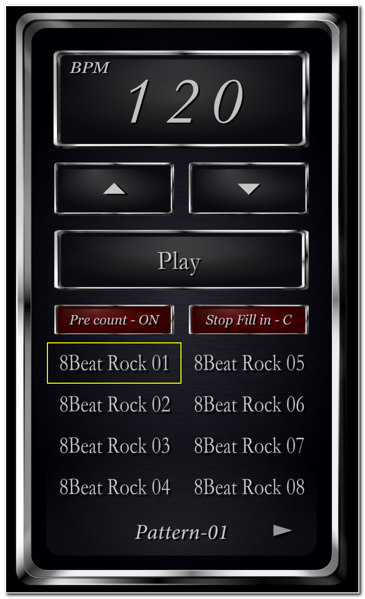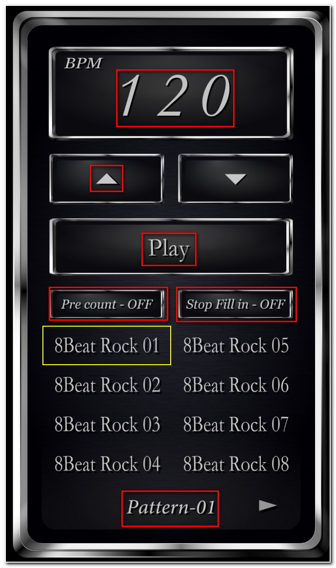 ▶ Pattern-01~06 옆의 ◀▶을 누르면 리듬 패턴이 바뀌어요.