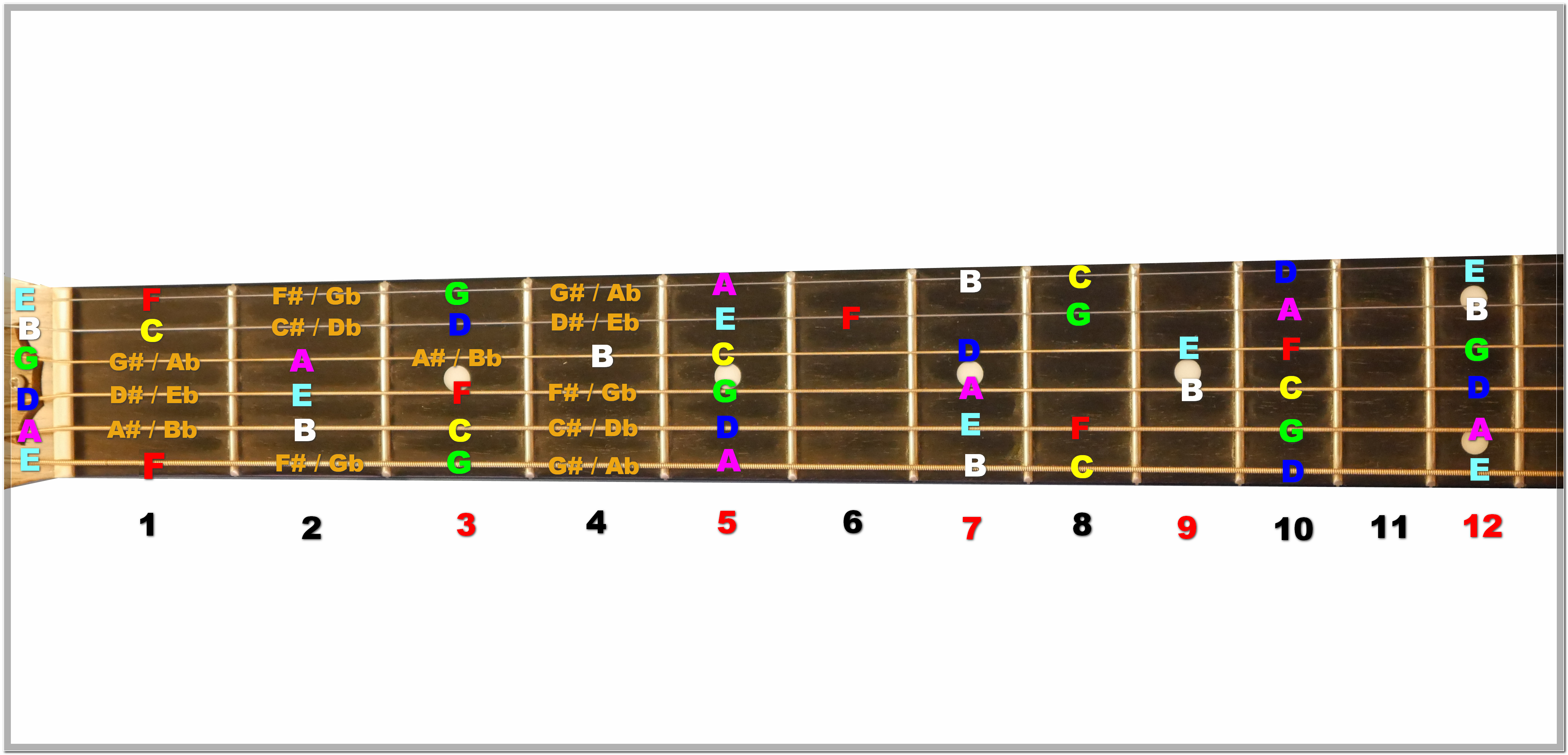 ▶ 거꾸로 1번줄 5번 프렛 A부터 6번줄 개방현까지 내려갑니다. 빨간색이 개방현이예요.